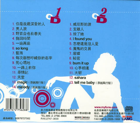 アルバムジャケットの裏面(クリックすると拡大)。画像は「白爛日報」から。DISK 1の13「magic(原創風行版)」と14「melody(原創風行版)」が問題の二曲なのだが、「原創」とは「オリジナル」のこと。