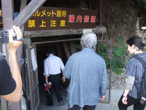 長野俊英高校の土屋副校長が先頭に立ち、立花隆氏以下一同、地下壕へ入る。