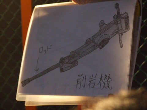 削岩機の図解。「削岩機は、コンプレッサーから送られる圧縮空気を操作する搾手部と、回転する鉄棒のロッド部と、その先端についた岩を砕くビットから成っている。当時はこの削岩機により岩に穴を開け、そこにダイナマイトを仕掛け破砕した。この時抜けなくなったロッドが壕内に数本ある。なお、削岩機のロッドによる穴跡は壁面に無数に残っている」(案内板より)。天井に、先端部のロッドが突き刺さったまま残っている。