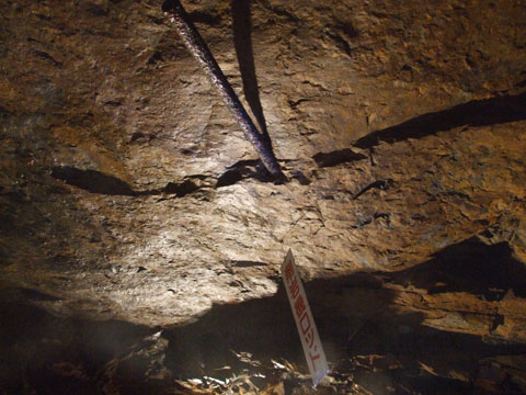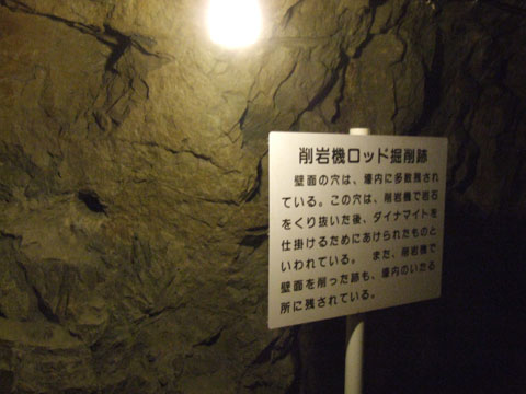 写真左に削岩機ロッド掘削跡の穴がある。「壁面の穴は、壕内に多数残されている。この穴は、削岩機で岩石をくり抜いた後、ダイナマイトを仕掛けるためにあけられたものといわれている。また、削岩機で壁面を削った跡も、壕内のいたる所に残されている」(案内板より)