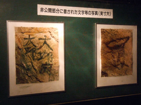 終戦後、労働者が壕内に落書きしたものと思われる。左は当初「大阪」と思われた時期もあったが、現在は韓国の地名「大邱(テグ)」とされている。おそらくは労働者の出身地であろう。右の図は、当初は水兵の図とされていたこともあったが、現在は韓国の伝統衣装・帽子をかぶった人の図であるとされている。