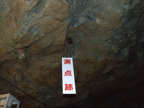 天井の「測点跡」。「壕を精巧な網の目状に掘削するにあたり、壕の東西・水平を測量した跡といわれている。天井に四角い杭がささっており、その先には釘の先端が残されているが、これは測量時に測量器をぶら下げたものと考えられている」(案内板より)