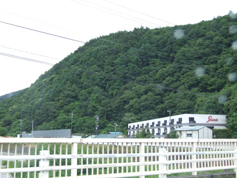 金華橋から金華山を見る。手前にあるのがホテル志摩(ラブホ)。川沿いに少し東へ行ったところが地下工場の入り口になる。タクシー等で行く場合はここを目印にするとよい。金華山には登山道もあるそうだが、今回は登っていない。