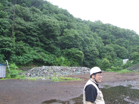 案内の平川先生。山の麓に、ゴミの山が積み上げられている。そのゴミの山を乗り越えて、その奥の木々の間に入り口がある。