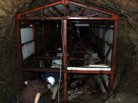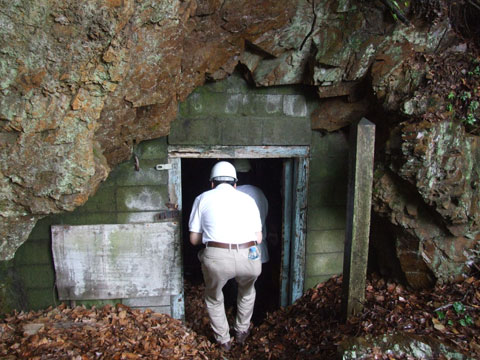 地下工場入り口の前。ヘルメットと軍手を装着し、懐中電灯を装備する。