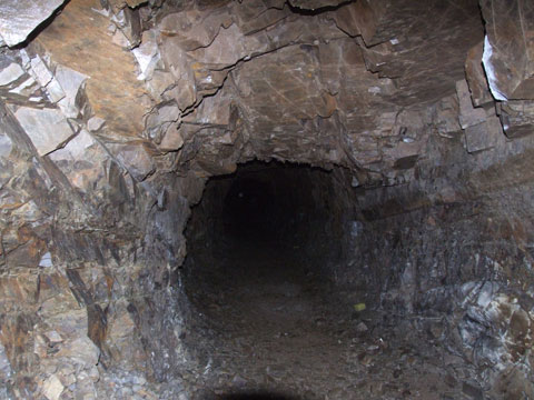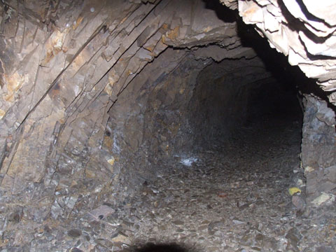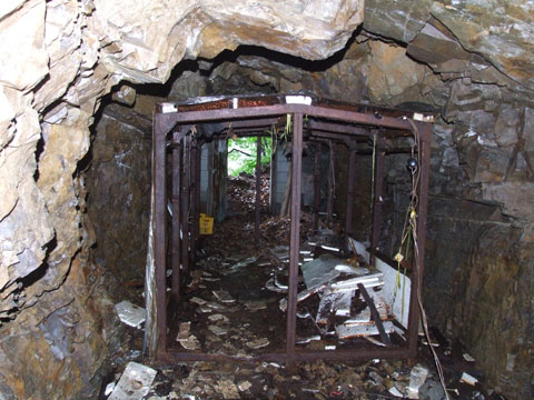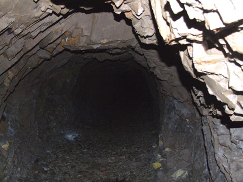 入ってすぐのところから入り口を振り返る。戦後、この地下壕は信州大学文理学部物理学科の宇宙線研究のために利用されたため、この入り口が入れるように残ったものである。